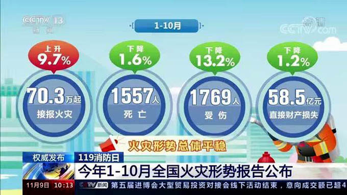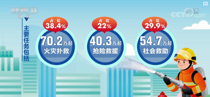 关于消防救援抢险,今年前10个月,各级消防救援队伍共出动208.8万次,比去年同期上升11.3%。主要任务包括:火灾扑救70.2万起,占比38.4%;抢险救援40.3万起,占比22%;社会救助54.7万起,占比29.9%。
