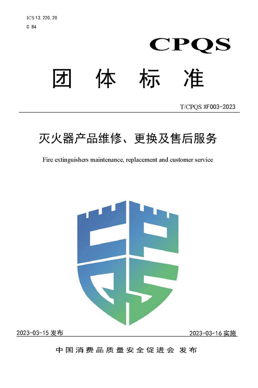 中国消费品质量安全促进会批准由其消防产品工作委员会组织编写了《灭火器产品维修、更换及售后服务》T/CPQS XF003-2023团体标准,并顺利通过了标准审查,在3月15日获批发布。