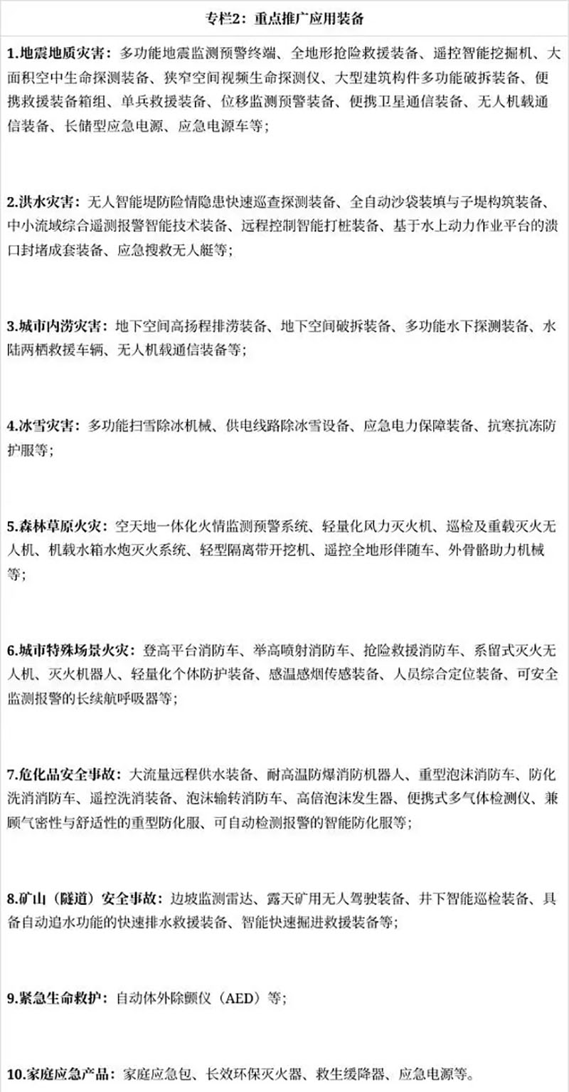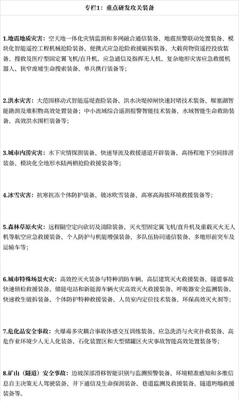聚焦地震和地质灾害、洪水灾害、城市内涝灾害、冰雪灾害、森林草原火灾、城市特殊场景火灾、危化品安全事故、矿山(隧道)安全事故、紧急生命救护、家庭应急等场景应用的重点安全应急装备,强化核心技术攻关及推广应用,加强先进适用安全应急装备供给,提高灾害事故防控和应急救援处置能力。