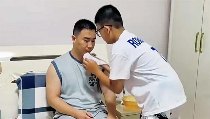 库学辉12岁的儿子库渤尊是沧州市肃宁县第四中学的一名初一学生。今年暑假,他开始跟着妈妈学习照顾父亲。白天,库学辉的同事来家里帮助库学辉做康复训练,库渤尊就趁着有人照顾父亲抓紧时间休息和学习。到了晚上,他便和妈妈一起照顾库学辉。库渤尊跟着妈妈学了不少康复动作,他会耐心地帮助父亲把脚绑在仪器上做康复训练,也会像个小老师一样帮父亲进行认知练习,锻炼手指的灵活度。等到康复训练结束后,他还会给父亲按摩、擦洗身体,有时两人还在一个盆里洗脚。库渤尊告诉记者:“以前爸爸没生病的时候我俩经常晚上一起泡脚,小时候爸爸给我洗脚,现在我长大了,我给爸爸洗。”