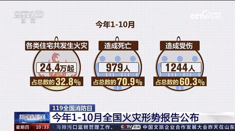 报告显示,今年1至10月,全国共接报火灾74.5万起,死亡1381人,受伤2063人,直接财产损失61.5亿元。与去年同期相比,火灾起数和受伤人数分别上升2.5%和6.5%,死亡人数和财产损失则分别下降13.2%和9.7%。